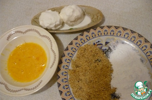 • Орехи и печенье превратить в крупную крошку. Яйцо немного взбить. Достаем наше мороженое. Обваливаем сначала в крахмале, затем в яйце и наконец в крошке из печенья с орехами.