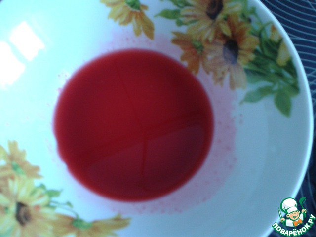 .. или, как в моём случае, кастрюльку с киселём поставить в кастрюлю с холодной водой (так намного быстрее). Остудить до 50° С (примерно) и только тогда по капельке, хорошо размешивая, влить клюквенный сок в кисель.