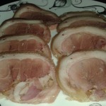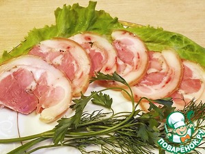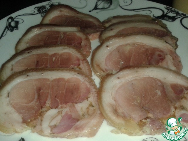 p.s. Нужно отметить особо, что красноватый цвет готовой рульки обеспечивается использованием посолочной смеси: к поваренной соли добавлена 1% калийная селитра. Без селитры цвет на срезе будет сероватый.