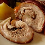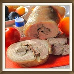 Упаковать рулет в пищевую пленку и перевязать бечёвкой. Убрать в холодильник на сутки - двое. Пусть помаринуется. Затем извлечь рулет из холодильника и положить в достаточно большую кастрюльку. Залить рульку кипятком и далее варить при 80*С около 90 мин.