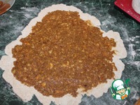 На раскатанное тесто выкладываем половину начинки, не доходя до краев 0,5 см.