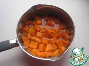В небольшую кастрюльку (ковшик) складываем тыкву, насыпаем сахар и наливаем воду. Доводим до кипения, помешивая. Накрываем крышкой и готовим на среднем огне 20 мин.