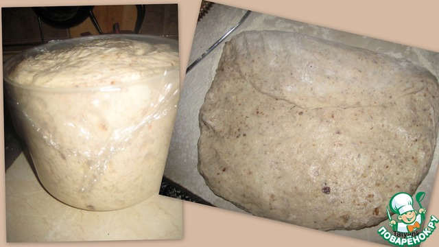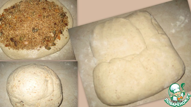 Выложите тесто на подпыленную мукой рабочую поверхность, расплющьте в пласт, посыпьте орехами и семечками. Сложите тесто конвертом и вымесите еще раз, чтобы орехи и семечки равномерно распределились в тесте. Верните тесто в миску, затяните пленкой и оставьте еще на 1,5 ч. для увеличения объема вдвое. Я оставила на кухонном столе на ночь.