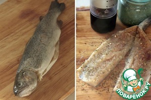 Для приготовления этого солнечного блюда нам понадобится речная форель (свежая или размороженная). Очищаем ее от головы, плавников, разрезаем вдоль хребта и убираем все кости. Добавляем специи для рыбы и соль.