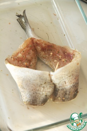 Форель заколоть зубочисткой у основания, придав ей форму сердечка. Налить в форму для запекания 50мл. воды и отправить рыбу в духовку, разогретую до 180 градусов, на 7 минут.