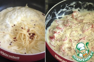 Приготовим начинку для рыбы - на сковороде подогреем сливки, добавим натертый сыр и перец чили. Все перемешаем, добавим креветки и крабовые палочки, немного свежемолотого перца.