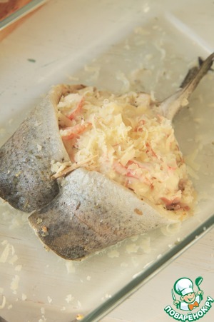 Рыбу достать из духовки, наполнить сливочной начинкой, присыпать сыром и отправить под гриль (200гр.) на 5 минут.