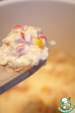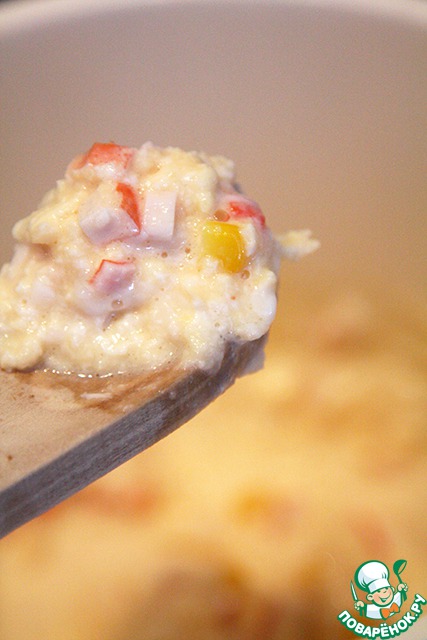 Приготовление элементарно, время 15 минут указано с учетом варки кукурузы. Впрочем, можно использовать консервированную, тогда приготовление займет вообще 5 минут! Итак, нам понадобится водяная баня. Если специальной кастрюли нет, берем две разного размера, одну ставим в другую, в бОльшую наливаем горячую воду (она должна будет быть вровень с яйцами в мЕньшей кастрюле), доводим до кипения и ставим в нее вторую кастрюлю с яйцами. Пусть Вас не смущает фото, я делала сначала из одного, но в процессе поняла, что нужно два. Теперь на среднем огне мешаем яйца, когда они загустеют, добавляем оливковое масло (на глаз, около ч. л. на 1 яйцо), соль и начинку.