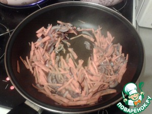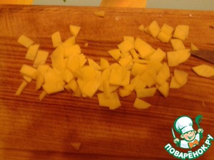 Пока бульон варится, можно приготовить поджарку из моркови и лука. Для этого их мелко нарезаем (лук кубиками, морковь соломкой). Хотя можно морковь и на терке натереть или нарезать кружочками (все на усмотрение хозяйки). Обжариваем овощи на небольшом количестве растительного масла до золотистого цвета.