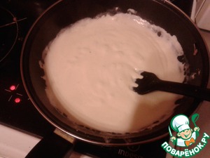 Дальше готовим сметанную заправку. На растительном масле обжариваем муку, тщательно помешивая. Затем вводим к муке сметану и продолжаем мешать.