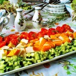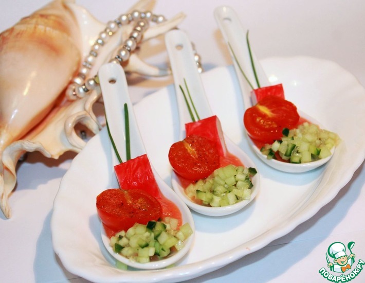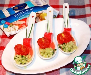Теперь можно сервировать: Разлить томатный соус по ложечкам, с краю выложить огурчики, окунуть в соус кусочек крабовой палочки, украсить перышками зеленого лука и томленой помидоркой, посыпанной свежесмолотым перчиком