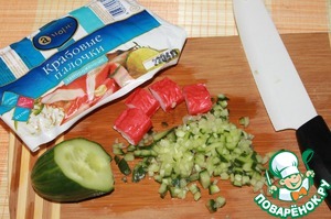 Огурчик нарезать меленькими кубиками, крабовые палочки на 4 части поперек