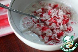 Пока картофель запекается, приготовим соус, который и сыграет роль главной скрипки в нашем рецепте))). Укроп нужно помыть и мелко нарезать (у меня был замороженный), добавить его в сметану. Туда же - измельченный чеснок и мелко нарезанные крабовые палочки. Посолить и поперчить по вкусу. Все хорошенько перемешать.