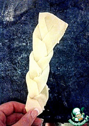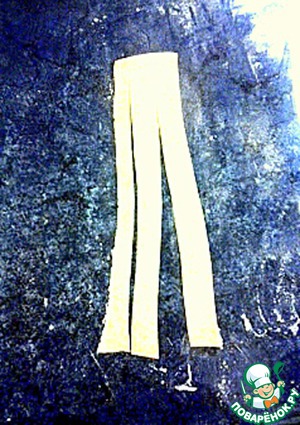 Нарезаем тесто полосками. С одного края отступаем примерно 1 см и разрезаем вдоль до конца. Нужно сделать так, чтобы получилось 3 полоски.