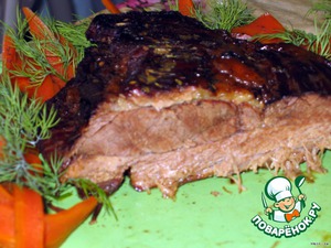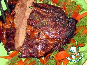 Тушить мясо в разогретой до 200С духовке 2 часа (можно больше, если вы любите сильно поджаренное мясо), периодически поливая сверху маринадом из сковородки. Если вся жидкость испарится, добавить маринада.