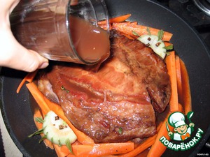 Положить в сковородку к мясу морковь, лук, чеснок (очищенный), зелень, залить все 2 стаканами процеженного маринада. Сковородку накрыть крышкой.