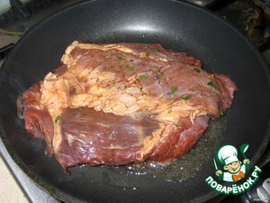 Достать мясо, просушить бумажным полотенцем или салфеткой. Обжарить со всех сторон на разогретой сковородке с небольшим количеством оливкового (можно подсолнечного, но без запаха) масле. Хорошо посолить, поперчить.