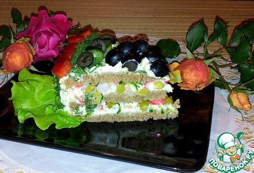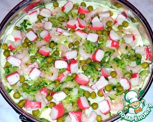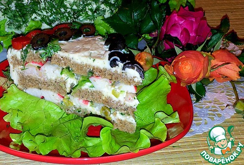 Рецепт «Закусочный торт с крабовыми палочками и креветками»: