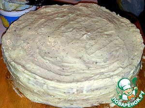 Четвёртая баночка сыра уйдёт для обмазывания боков. Накрыть верх формы крышкой и убрать в холодильник. На другой день края формы обвести ножом, т. е отделить торт от стенки.