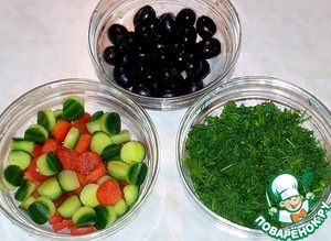Ингредиенты для закусочного торта - хлеб ржаной, сыр плавленый с зеленью, крабовые палочки, креветки коктейльные, зелёный горошек консервированный, красный болгарский перец, оливки чёрные, огурец свежий.