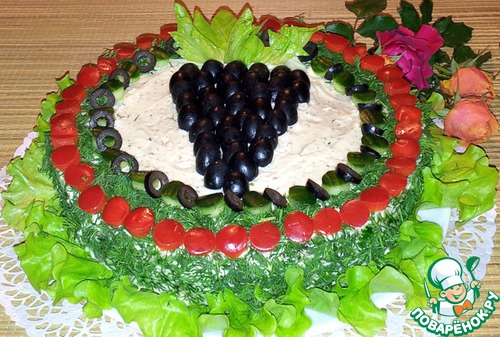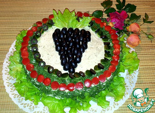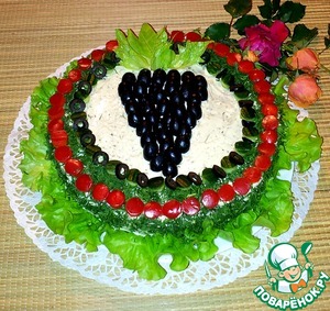 По середине из оливок выложить виноградную гроздь. Из салатных листьев вырезать листочки похожие на виноградные.
