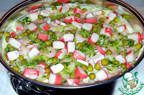 На сыр разложить горошек, тёртый огурец, креветки и нарезанные крабовые палочки.