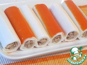 Выложить начинку на развернутую крабовую палочку и завернуть в трубочку.