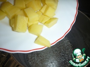 Нарезаем картофель на кубики, опускаем в соленую воду, варим до готовности.