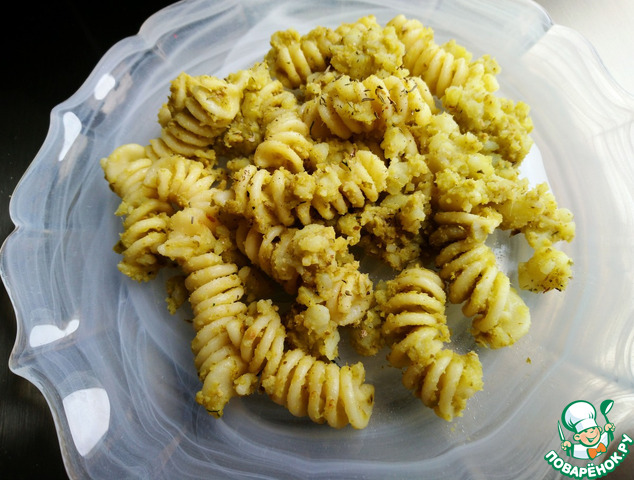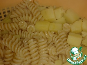 Когда картофель готов, опускаем в воду фузилли, готовим по времени, как указано на упаковке. Фузилли фирмы DE CECCO готовлю 9 минут после закипания. -
