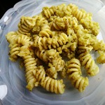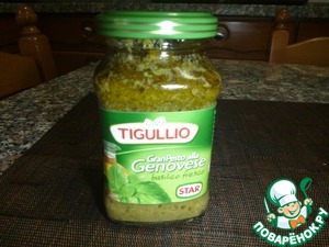 В состав песто входит базилик зеленый, оливковое масло, пармезан, кедровые орешки, чеснок, соль. Предпочитаю покупать Pesto Genovese, превосходное и, наверное, самое вкусное. Первое упоминание о песто относится к 1865 году - "толченая ароматная смесь базилика и чеснока для украшения разных видов пасты". Отделяем полбаночки (приблизительно 100 гр) песто, добавляем 2-3 столовые ложки воды, в которой варился картофель, хорошо перемешиваем.