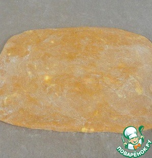 На пекарской бумаге, слегка припудренной мукой, раскатать тесто прямоугольником.