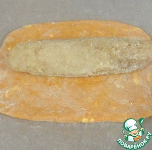 На тесто укладываем фарш, предварительно придать ему цилиндрическую форму.