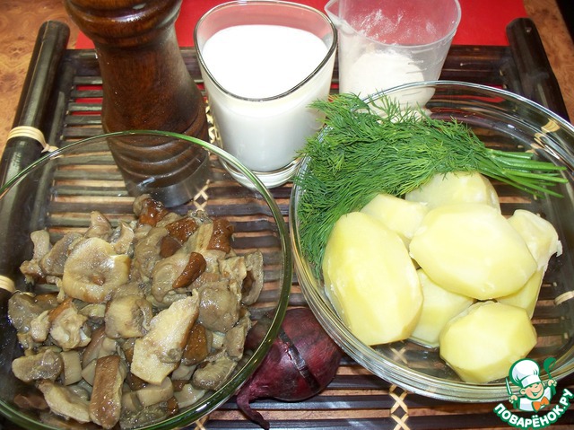 Грибы смешиваем с укропом, луком, картофелем, сливками, мукой. Добавляем соль и перец.
