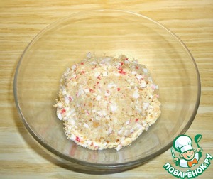 Крабовые палочки мелко нарезать и добавить к измельчённому крекеру.