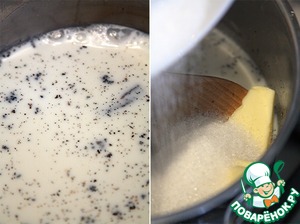Итак, молоко выливаем в небольшую кастрюлю, ставим на плиту, в молоко кладем стручок и семечки ванили, нагреваем почти до кипения, добавляем сахар, масло и немного томим на маленьком огне, чтобы масло "растаяло", а сахар растворился. Даем жидкости остыть до комнатной температуры.