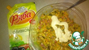 Отправляем лук с морковкой к остальным ингредиентам, перемешиваем, добавляем майонез (его необходимо минимальное количество, так как салат не сухой ввиду наличия колбаски с жирком и масла на морковке).