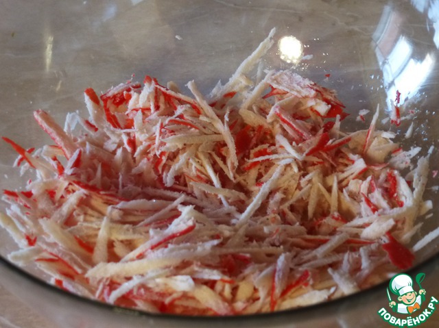 Натереть на крупной терки замороженные крабовые палочки «А’море».