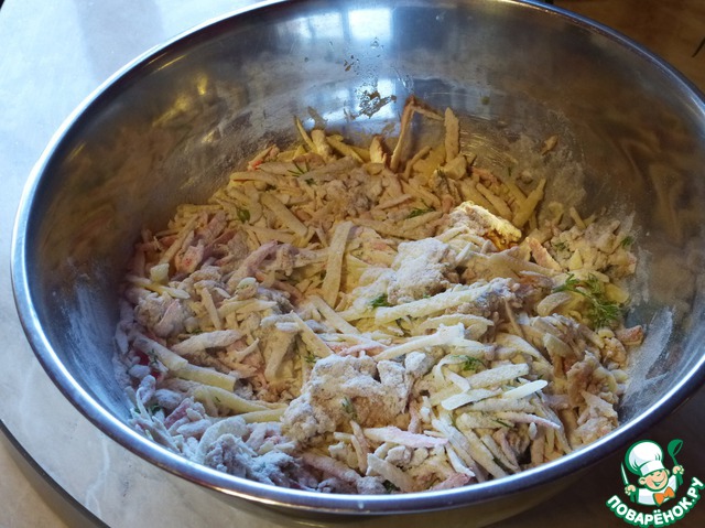 Смешать в миске муку, разрыхлитель теста, крабовые палочки, горбушу, сыр, укроп, приправу, соль.