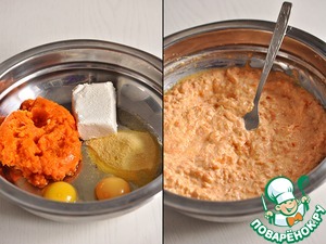 В чашке соединить морковное пюре, творог, яйца, кукурузную муку, соль, перец, тмин. Взбить всё вилочкой до однородного теста.
