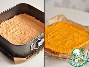 На дно квадратной формы (размером 25 на 25 см.) положить бумагу для выпечки, перелить туда тесто и поставить запекаться в нагретую духовку до 180 гр. на 15 минут.