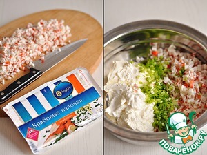 Крабовые палочки мелко нарезать. В чашке соединить творожный сыр (крем-чиз), крабовые палочки, зеленый лук, мелко нарезанный. Смешать всё до однородного крема