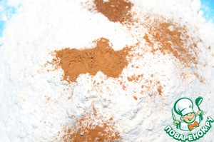 Смешать муку, сахарную пудру 150 г, корицу, перец, мускат, гвоздику, соль, разрыхлитель и соду. -