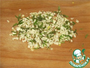 Мелко нарезать чеснок с листиками тимьяна.