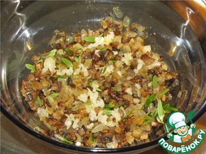 Лук и ножки грибов мелко нарезать и обжарить на оливковом масле