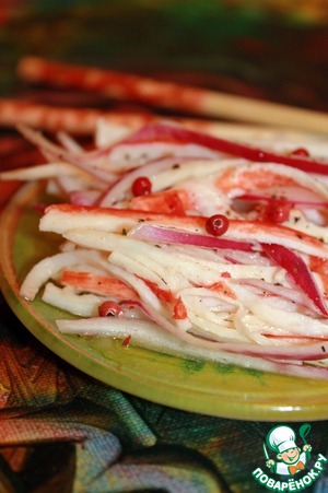 Порезать полукольцами лук и добавить к крабовым палочкам -