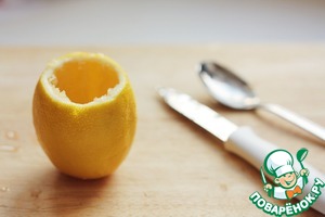 2. Аккуратно, с помощью ложки и ножа вынуть мякоть из лимона, чтобы получился стаканчик.