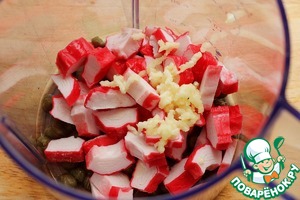 4. В чашу блендера поместить каперсы, крабовые палочки и измельченный чеснок.