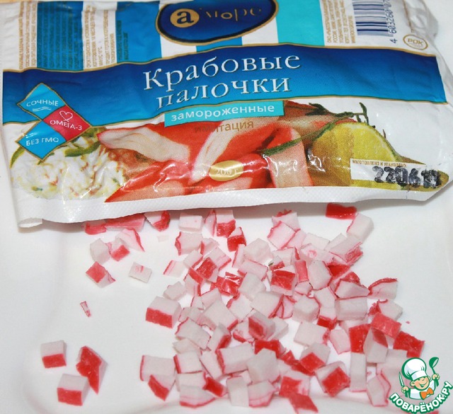 • Приготовим начинку для булочек. Для этого нужно крабовые палочки ТМ "А’море" мелко нарезать.