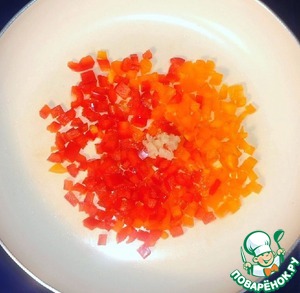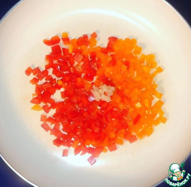 • Болгарский перец с очищенным прессованным чесноком обжарить на растительном масле до мягкости на среднем огне.