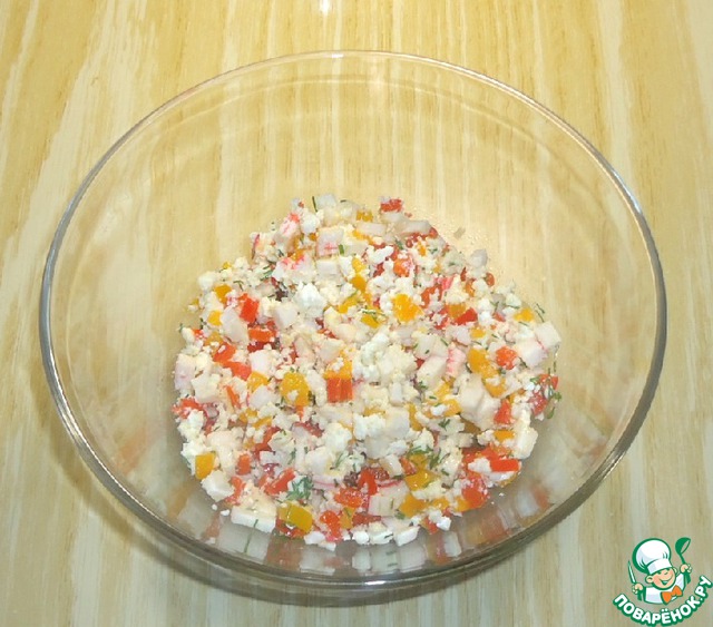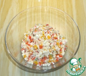 • В чашке соединить крабовые палочки и болгарский перец. Брынзу размять вилкой, зелень мелко нарезать и добавить к остальным ингредиентам.